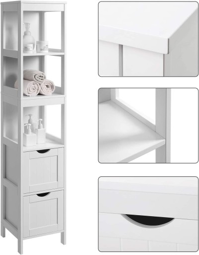 Szafka została wyposażona w chromowaną gałkę oraz dwa zamontowane na bokach uchwyty/wieszaki na ręcznik.