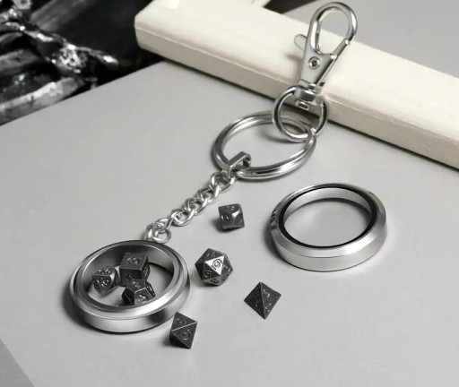Metalowy breloczek na malutki zestaw 7 kości RPG to idealny dodatek dla miłośników gier fabularnych, którzy chcą mieć przy sobie zestaw kości na każdą okazję.