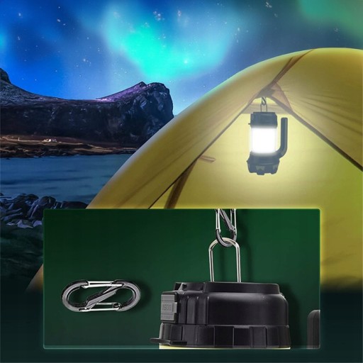Na spodzie latarki znajdziesz haczyk. Dzięki dołączonemu do zestawu karabińczykowi, bez problemu zawiesisz latarkę w górnej części namiotu lub pomieszczenia. W taki sposób posłuży ona jako latarnia oświetlająca całą przestrzeń wokół siebie.
