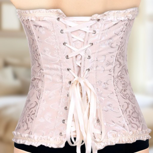 Wiązany gorset typu OVERBUST wykonany z gęstej wytrzymałej tkaniny o dyskretnym, kwiecistym wzorze. Konstrukcja wykonana z 12 mocnych fiszbin gorsetowych