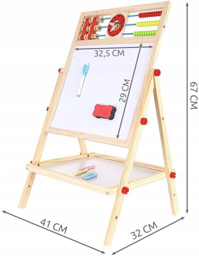 W zestawie z tablicą znajdują się również mazak do tablicy magnetycznej, pudełko kolorowej kredy, gąbka oraz alfabet i liczydło z zabawkowym zegarkiem.