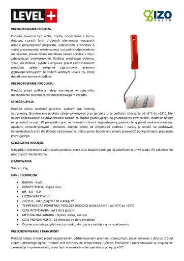 Podłoże powinno być suche, czyste, oczyszczone z kurzu, tłuszczu, starych farb, drobnych elementów mogących osłabić przyczepność preparatu. Zabrudzenia i warstwy o słabej przyczepności należy usunąć i uzupełnić odpowiednim materiałem, powierzchnie metalowe należy oczyścić z rdzy i zabezpieczyć antykorozyjnie. Podłoża wyjątkowo chłonne, stare, niestabilne, pyliste i osypliwe przed zastosowaniem produktu należy wstępnie zagruntować gruntem głębokopenetrującym ze szkłem wodnym Level+ 05, który dodatkowo wzmocni podłoże.