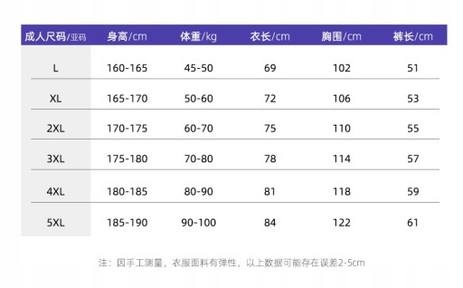Rozmiar: 24 (wysokość 130-140cm), 26 (wysokość 140-150cm), 28 (wysokość 150-155cm), 30 (wysokość 155-160cm), L (wysokość 160-165cm), XL (wysokość 165-170cm), 2XL (wysokość 170-175cm), 3XL (wysokość 175-180cm), 4XL (wysokość 180-185cm), 5XL (wysokość 185-190cm)