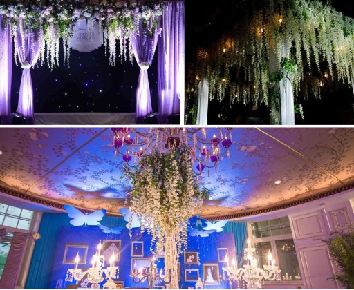 Kwiaty wisterii idealnie nadają się jako do dekoracji kościoła np. na ławkach lub na bramie pary młodej lub na sali na ścianie za parą młodą.