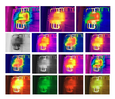 - Ironbow: Jest to inna paleta kolorów wykorzystująca odcienie tęczy, ale z wyraźnym użyciem koloru żelaza jako tła. Obiekty o niższych temperaturach są reprezentowane jako niebieskie, podczas gdy obiekty o wyższych temperaturach są reprezentowane jako czerwone.