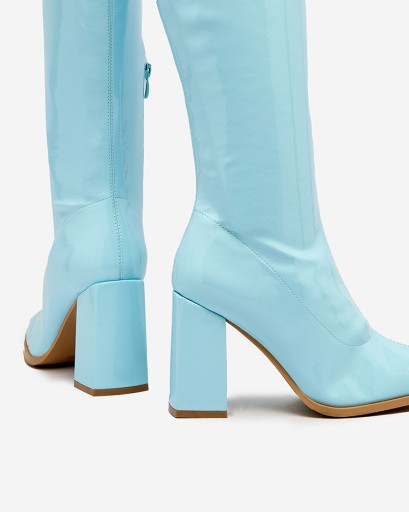 Stylowe damskie kozaki na słupku i z cholewką do kolana. Cholewka wykonana jest ze skóry ekologicznej lakierowanej i posiada tkaninową wkładkę. Model zapinany na zamek z kwadratowym noskiem. Idealne do tworzenia eleganckich outfitów!
