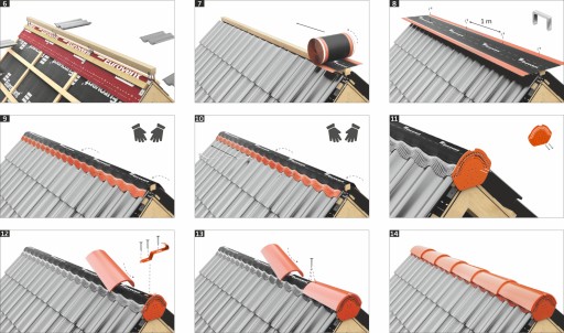 Taśmę układa się na łacie kalenicowej, pod gąsior. Przed montażem należy odpowiednio oczyścić i osuszyć pokrycie, do którego kleimy taśmę.