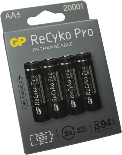Akumulatory GP ReCyko Pro to wydajne i wygodne źródła energii odpowiednie dla wielu zastosowań. Wszystkie modele z serii Pro pozostają długo naładowane i mogą być ładowane do 1500 razy. Dzięki zastosowanej technologii o nazwie Ready2Use (gotowe do użycia), zachowują moc do 70%, nawet po 5 latach leżenia (gdy nie są używane). To innowacyjne rozwiązanie dla osób oczekujących pełnych energii, wygodnych w stosowaniu, ekonomicznych i przyjaznych dla środowiska akumulatorów. Mogą być stosowane do wszystkich możliwych urządzeń, w których stosuje się zwykłe baterie R6.