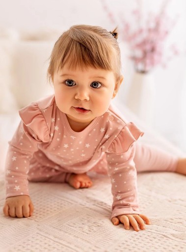 Tunika posiada uroczą falbankę zarówno w pasie jaki na rękawkach. Zapinana jest na bezniklowe napy, więc masz pewność, że jest ono bezpiecznie dla twojego maluszka. Bawełniane ubranka zapewnią dziecku odpowiednią izolację przed zimnem, nie blokując równocześnie swobodnego przepływu powietrza, eliminując tym samym problem pocenia się. Dzięki wykorzystanym naturalnym materiałom, możemy być spokojni o kondycję skóry malucha. Komfortowa tunika w gwiazdki to must have w szafie każdej małej Gwiazdeczki.
