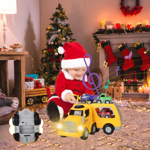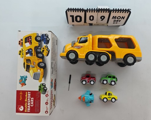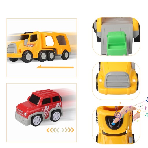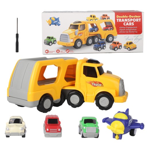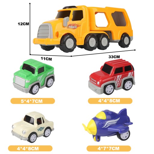 - Zawiera jeden duży samochód do transportu i cztery mini samochody.
