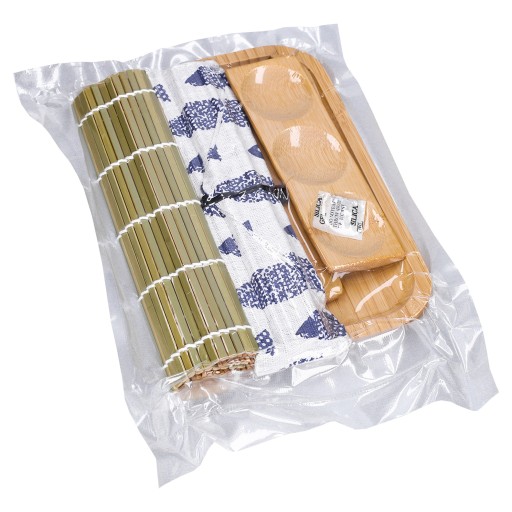 Oryginalny, bambusowy zestaw do przygotowania i serwowania Sushi dla 5 osób. Komplet akcesoriów wykonany w 100% z prawdziwego bambusa. Elementy zestawu nie zawierają plastiku, a tym samym są w pełni bezpieczne dla zdrowia użytkownika. Produkt BPA Free, nie zawiera szkodliwego Bisfenolu A. Materiał, z którego wykonano zestaw jest w pełni biodegradowalny, przyjazny dla środowiska naturalnego.