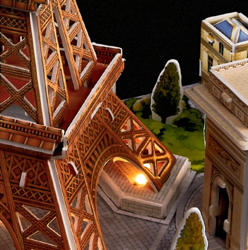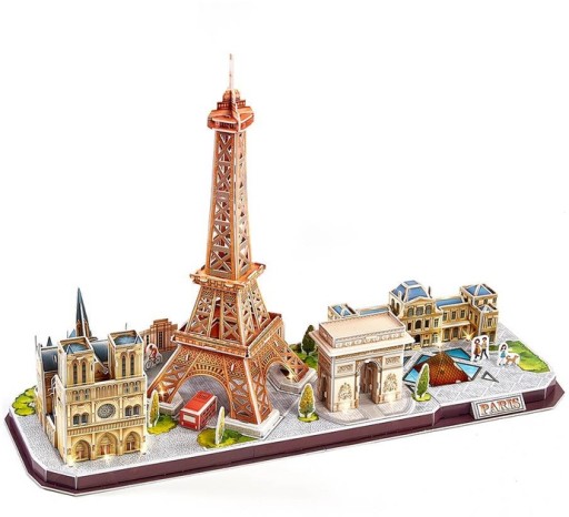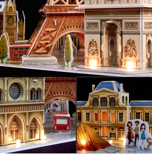 Puzzle 3D LED ukazujące najpopularniejsze atrakcje - "symbole" Paryża. To, co dziś najbardziej kojarzy się z Paryżem, to prawdopodobnie Wieża Eiffla, Katedra Notre-Dame, Luwr, Pola Elizejskie i Łuk Triumfalny.