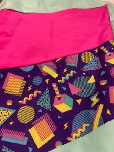 Strój w kolorze seledynowym z różowymi oraz fioletowymi wstawkami w kolorowe wzory.