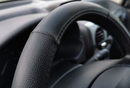 Pokrowiec na kierownicę wykonany z wysokiej jakości ekoskóry perforowanej połączonej z ekoskórą gładką.