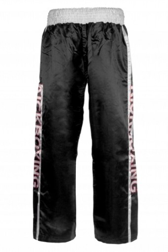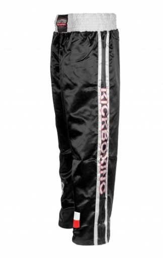 Długie spodnie do kickboxingu. Doskonale sprawdzą się podczas najważniejszych zawodów czy treningów. Szeroka guma w wyróżniającym się kolorze i wewnętrzne sznurki utrzymują spodnie we właściwym miejscu. Bardzo duży klin pozwala na większą swobodę ruchu i wygodę przy noszeniu suspensora. Na jednej nogawce nadruk z polską flagą, a na drugiej logo WAKO - posiadają atest do startu w zawodach kickboxingu.