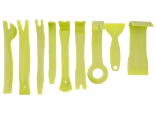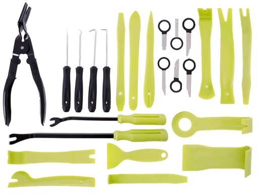 Zestaw zawiera uniwersalne wyjmaki pozwalające sprawnie zdemontować radia, ekrany, nawigacje itp. bez uszkadzania tapicerki.