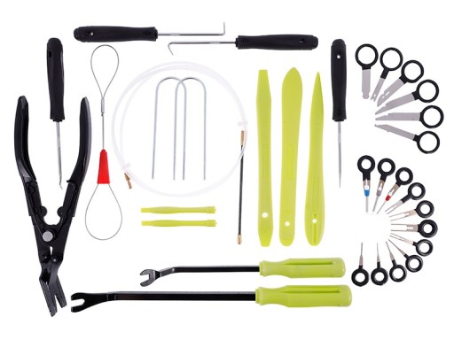 Specjalistyczny zestaw zawierający klucze i ściągacze do demontażu radia, kostek, listew, spinek i tapicerki.