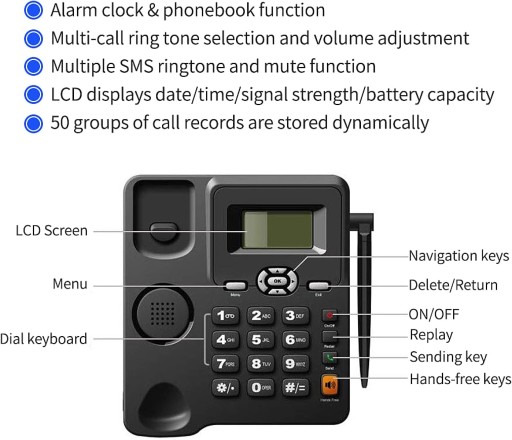 - Stały telefon bezprzewodowy – nasz telefon stołowy obsługuje dwie karty SIM i wiele częstotliwości GSM, w tym 850/900/1800/1900 MHz i sieci 2G.