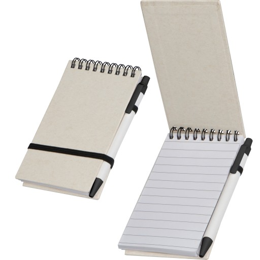 Notes wykonany z kartonu po mleku, ze 140 stronami w linię, zamknięciem na gumkę, i długopisem z niebieskim wkładem.