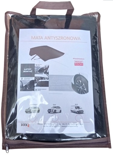 - Montaż i demontaż maty jest bardzo prosty. Wystarczy założyć matę na szybę, przełożyć boczne panele przez drzwi i przytrzasnąć, oraz założyć dodatkowe zabezpieczenia na lusterka i koła