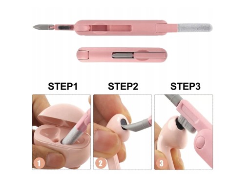 czyszczenie: składany długopis z silikonową końcówką, mały pędzel o dużej gęstości i flokująca gąbka, idealny do czyszczenia wkładek dousznych, etui na słuchawki i telefony. Silikonowa końcówka służy do czyszczenia szczelin. Mały z wysoką gęstość pędzla doskonale nadaje się do głębokiego czyszczenia powierzchni siatkowych z kurzu. Flokująca gąbka służy do czyszczenia otworu w etui z funkcją ładowania.
