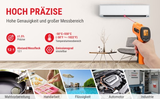 - 12:1 Stan/punkt pomiarowy: termometr laserowy umożliwia precyzyjne zmierzenie temperatury powierzchni obiektu z odległości i bezdotykowe, dzięki czemu miernik temperatury spełnia swoje zadanie zarówno w kuchni, jak i w fabrykach.