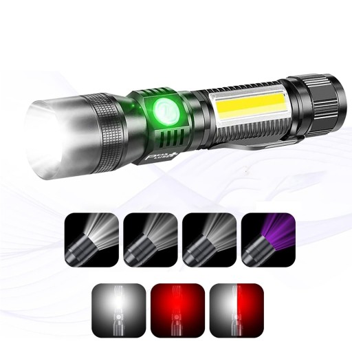 - ✔️7 trybów: wysoka jasność, normalna jasność, lampa błyskowa, światło ultrafioletowe, światło boczne białe światło, światło boczne czerwone światło, światło boczne czerwone i białe wyświetlane na przemian.