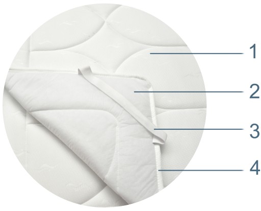 Nakładka PRESTIGE TOPPER PLUS starannie wykonana jest z czterech warstw materiałów przepikowanych razem ze sobą w spójny gruby i komfortowy topper. Wierzchnia warstwa to bardzo miła w dotyku i odporna na uszkodzenia mechaniczne antyalergiczna dzianina, pod którą kryją się dwie warstwy włókniny klimatyzującej 300 g/m² znacznie polepszającej cyrkulację powietrza oraz dodatkowa warstwa materiału poprawiająca wytrzymałość toppera. Krawędzie zabezpieczone i wykończone są odporną na przecieranie lamówką. Od spodu doszyte w rogach 4 gumki.