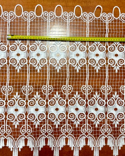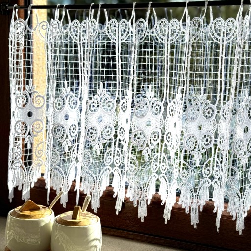 Przedmiotem sprzedaży jest gipiurowa śnieżnobiała firanka typu zazdrostka na szelkach o wysokości całkowitej 60 cm, pomimo zastosowania techniki przeplatania nici w grupach firaneczka nie jest zbyt ciężka , zastosowany ażurowy wzór nadaje lekkości i przejrzystości Firaneczka jest cięta z walka i nie wymaga obszywania , bardzo ważną cechą jest również to że nie trzeba jej prasować, dodatkowa zaletą jest fakt że można taką zazdrostkę powiesić również na żabkach karnisza.
