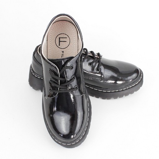 Filippo GLN441 czarne niskie glany. Wykonane z lakierowanej skóry, wykończony skórą oraz tkaniną środek buta, skórzana wkładka.