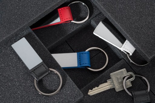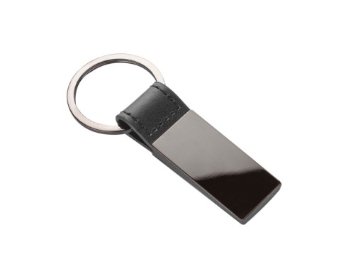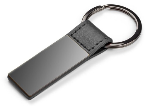 Elegancki dwustronny brelok wykonany z EKOskóry PU i metalu w kolorze grafitowym.
