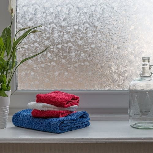- Teraz usuń papierowy spód nieprzezroczystej folii witrażowej i umieść kawałek folii na szybie. Pamiętaj przy tym, aby zachować odstęp od uszczelek.