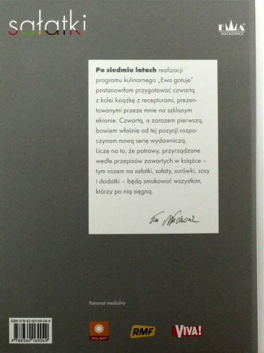 Po siedmiu latach realizacji programu kulinarnego "Ewa gotuje? postanowiłam przygotować czwartą z kolei książkę z recepturami, prezentowanymi przeze mnie na szklanym ekranie. Czwartą, a zarazem pierwszą, bowiem właśnie od tej pozycji rozpoczynam nową serię wydawniczą. Mam nadzieję, że Czytelnikom spodoba się nie tylko nowy layout, ale w ogóle cały pomysł na moją najnowszą publikację kulinarną. A przede wszystkim liczę na to, że potrawy, przyrządzone wedle przepisów zawartych w książce - tym razem na sałatki, sałaty, surówki, sosy i dodatki - będą smakować wszystkim, którzy po nią sięgną.Ewa Wachowicz