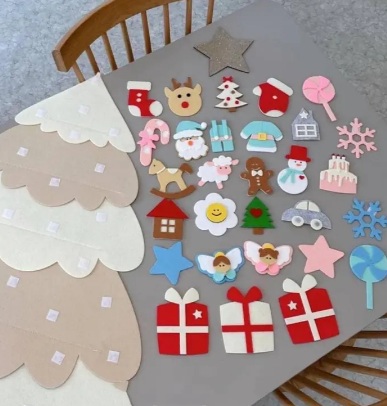 Filcowa beżowa choinka dla dzieci z dekoracjami na rzepy ( 30 elementów do ozdobienia). Wymiary choinki to ok.100 x 90 cm. Zabawka nie dość że nawiązuje do świątecznego klimatu i jest świetnym pomysłem na prezent dla malucha to rozwija kreatywność i zdolności manualne dziecka :) Przy użyciu gwoździka, zawieszki, przyssawki można powiesić na ścianie, ramie piętrowego łózka, drzwiach, oknie, sztywnej zasłonie :)