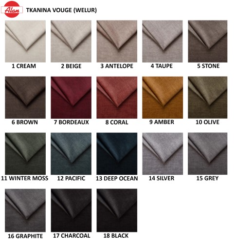Tkanina welurowa, miękka, gładka, przyjemna w dotyku. Odporna na mechacenie i wypychanie.