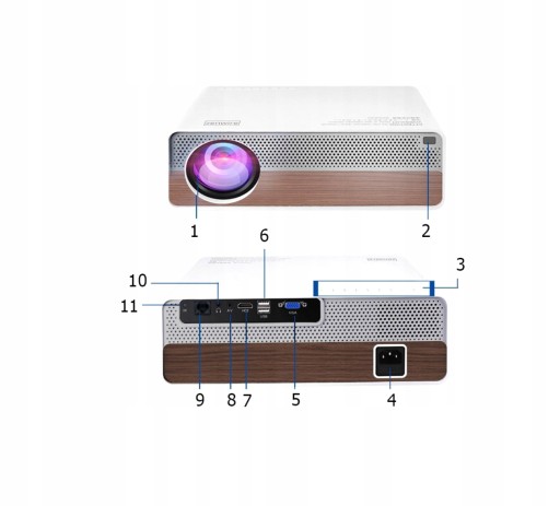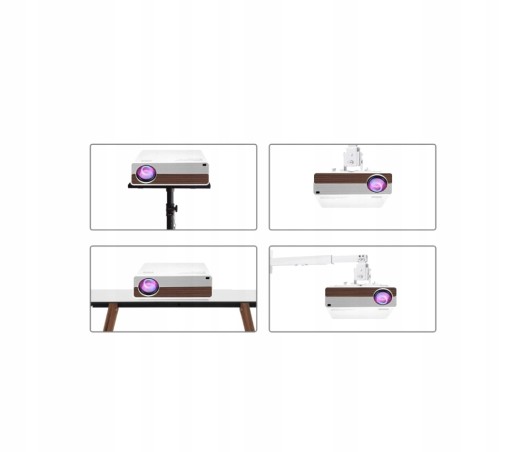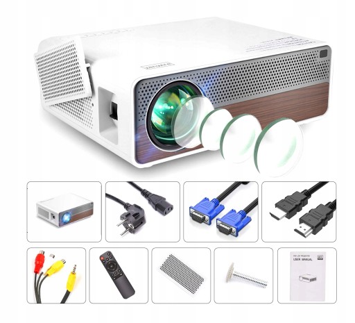 - W zestawie: Zasilacz, pilot, kabel HDMI, kabel VGA, przejściówka AV, podstawka umożliwiająca położenie projektora pod kątem, Instrukcja obsługi, gustowne opakowanie,