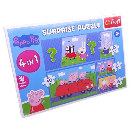 Przedmiotem oferty jest zestaw 4 układanek dla dzieci z motywem bohaterów bajki Świnka Peppa przygotowanych przez markę Trefl. Obrazki składają się z: 15, 15, 30 oraz 55 puzzli. Po ułożeniu układanek powstaną obrazki o wymiarach 15,5 x 11,75 cm; 23,5 x 15,5 cm, 47 x 17,5 cm. Zróżnicowana liczba elementów pozwala na zabawę zarówno młodszym, jak i nieco starszym dzieciom.