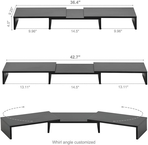 Większy rozmiar z większą przestrzenią: Przy najdłuższej szerokości 42,7 cala ta podstawka pod laptopa jest wystarczająco duża, aby obsługiwać dwa monitory. W zależności od konfiguracji możesz nawet mieć miejsce na umieszczenie głośnika lub innego urządzenia pośrodku. Tworzy pod spodem wystarczająco dużo miejsca na mniejsze akcesoria na biurko lub na schowanie klawiatury i myszy.