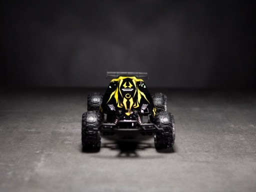 Giętkie i wytrzymałe materiały najwyższej jakości. Sztywna rama i wzmocnienia. Samochód jest odporny na uderzenia i upadki. Przedni zderzak zapewnia bezpieczeństwo podczas uderzeń, a tylny spojler pokazuje pazur i sportowe zacięcie auta.