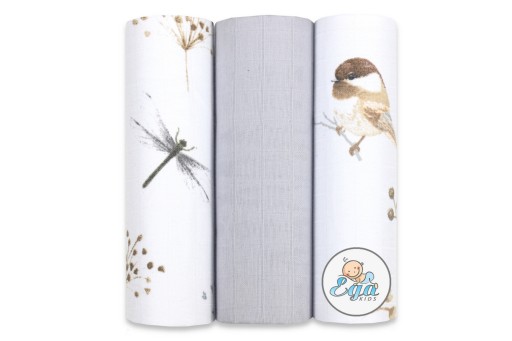 Komplet 3 miękkich i przewiewnych pieluszek muślinowych. W skład każdego kompletu wchodzą dwie pieluszki we wzory oraz jedna jednobarwna. Zestaw zapakowany jest w opakowanie foliowe z eurodziurką
