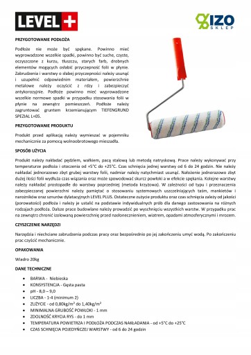 Produkt należy nakładać pędzlem, wałkiem, pacą stalową lub metodą natryskową. Prace należy wykonywać przy temperaturze podłoża i otoczenia od +5°C do +25°C. Czas schnięcia jednej warstwy od 6 do 24 godzin. Nie należy nakładać jednorazowo zbyt grubej warstwy folii, nadmiar należy natychmiast usunąć. Nałożenie jednorazowo zbyt dużej ilości folii wydłuża czas wiązania oraz może spowodować skurcz powłoki a w efekcie spękania. Kolejne warstwy należy nakładać prostopadle do warstwy poprzedniej (metoda krzyżowa). W zależności od typu i przeznaczenia zabezpieczanej powierzchni należy pamiętać o stosowaniu systemowych uszczelniających taśm, mankietów i narożników oraz sznurów dylatacyjnych LEVEL PLUS. Ostateczne zużycie produktu oraz czas schnięcia zależy od jakości (porowatości) podłoża i należy je ustalić na podstawie indywidualnych prób dla danego zastosowania na różnych rodzajach podłoża. Dalsze prace budowlane należy prowadzić po wyschnięciu wszystkich warstw. W przypadku prac na zewnątrz chronić izolowaną powierzchnię przed nasłonecznieniem, wiatrem, opadami atmosferycznymi i mrozem.