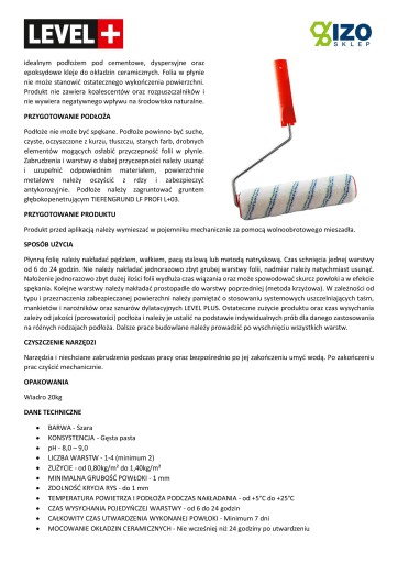 Płynna folia hydroizolacyjna przeznaczona jest do powierzchniowego bezspoinowego uszczelnienia podłoży o dużej intensywności zawilgocenia (kuchnie, łazienki, toalety, pralnie, kabiny prysznicowe) przed układaniem okładzin ceramicznych. Nadaje się do wykonywania elastycznych powłok przeciwwilgociowych i przeciwwodnych w systemach ogrzewania podłogowego. Produkt przeznaczony jest na podłoża betonowe, tynki cementowe, cementowo-wapienne, tynki gipsowe, bloczki gipsowe, płyty cementowe, gipsowo-kartonowe, gipsowo włóknowe i cementowo włóknowe, jastrychy. Po wyschnięciu tworzy bardzo elastyczną, odporną na zawilgocenia i wodę powłokę. Gotowa powłoka zabezpiecza powierzchnię przed szkodliwym działaniem olejów, smarów, grzybów, pleśni oraz wszelkich chemikaliów i detergentów stosowanych na co dzień w gospodarstwie domowym. Można stosować na powierzchnie pionowe oraz poziome, wewnątrz pomieszczeń. Po wyschnięciu tworzy szorstką powłokę, która została tak zaprojektowana aby była idealnym podłożem pod cementowe, dyspersyjne oraz epoksydowe kleje do okładzin ceramicznych. Folia w płynie nie może stanowić ostatecznego wykończenia powierzchni. Produkt nie zawiera koalescentów oraz rozpuszczalników i nie wywiera negatywnego wpływu na środowisko naturalne.