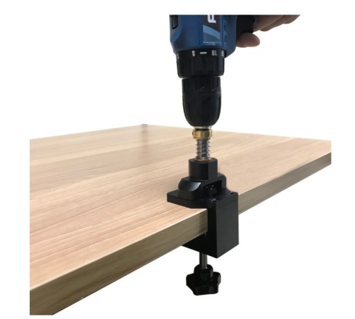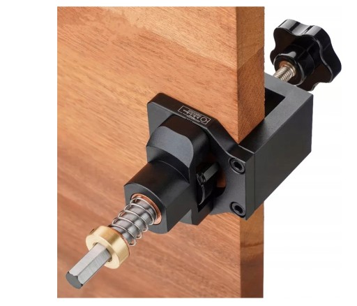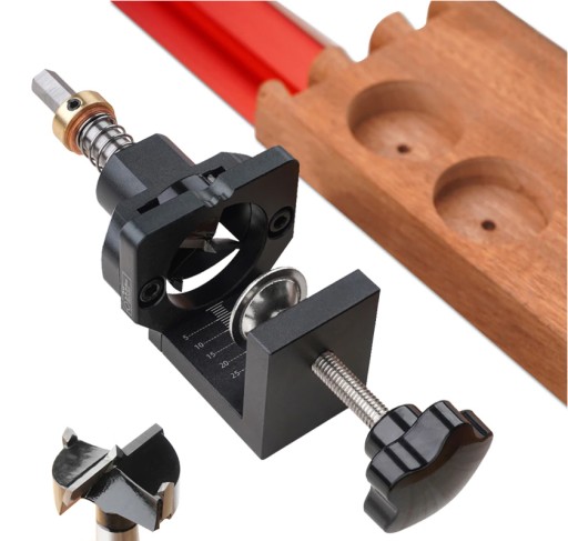 Prowadnica do wiercenia otworów pod zawiasy z urządzeniem zaciskowym do pozycjonowania osi, regulacji położenia marginesu i łatwej obsługi
