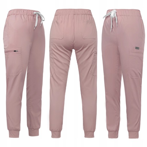 Spodnie medyczne mają średni stan i są regulowane troczkiem w pasie.