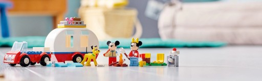 • Pudełko pełne zabawy – zabawka konstrukcyjna obejmuje samochód, przyczepę kempingową, minifigurki Myszki Miki i Myszki Minnie, figurkę LEGO® Pluto, biwak oraz inne akcesoria inspirujące do zabawy w podróże