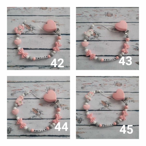Kolory na zdjęciach mogą nieznacznie odbiegać od kolorów rzeczywistych, co zależy od ustawień Państwa monitorów, czasem może się zdarzyć ze zabraknie nam jakiegoś elementu uzupełnimy go innym tak aby zawieszka wyglądała pięknie. Zawieszki w zależności od modelu są silikonowe lub silikonowo drewniane, jeśli państwo potrzebują jakieś zmiany można napisać. Literki w zależności od modelu są drewniane lub akrylowe.