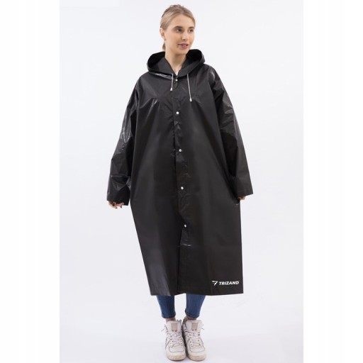 Płaszcz przeciwdeszczowy ma kaptur ze sznureczkami, który chroni głowę i włosy przed deszczem.