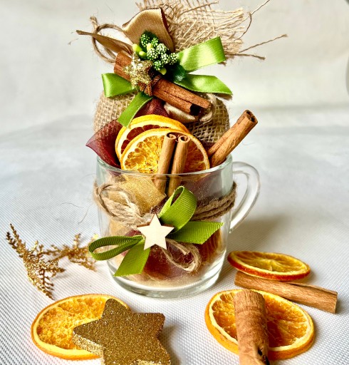- suszone plastry pomarańczy i laski cynamonu nadające charakter i zapach świąt,