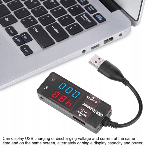 2. Mały rozmiar, może wyświetlać napięcie i prąd ładowania lub rozładowania USB w tym samym czasie i na tym samym ekranie, naprzemiennie lub pojedynczo wyświetlać pojemność i moc.