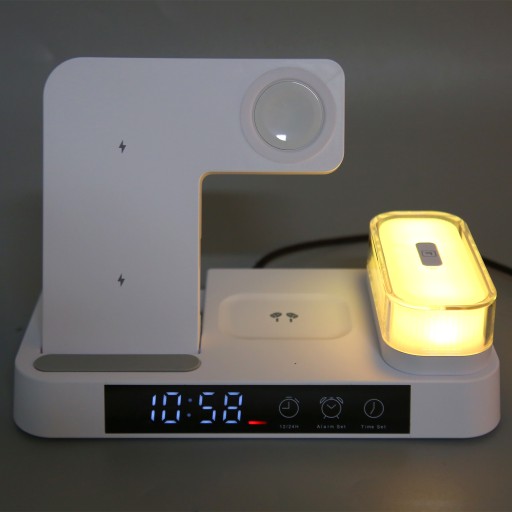 1. Wielofunkcyjny 4 w 1: zawiera bezprzewodową podstawkę ładującą 4 w 1, cyfrowy budzik i regulowaną 7-kolorową lampkę nocną. Stacje ładujące do wielu urządzeń, iPhone'ów, smartfonów, iWatch i słuchawek.